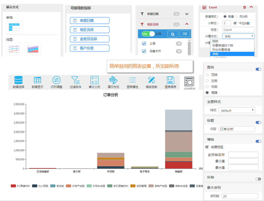 在右侧几个功能选项进行对图表的操作,分为图例的放置位置包括了[顶端、左上、右下、底端],主题样式包括[default、dark、